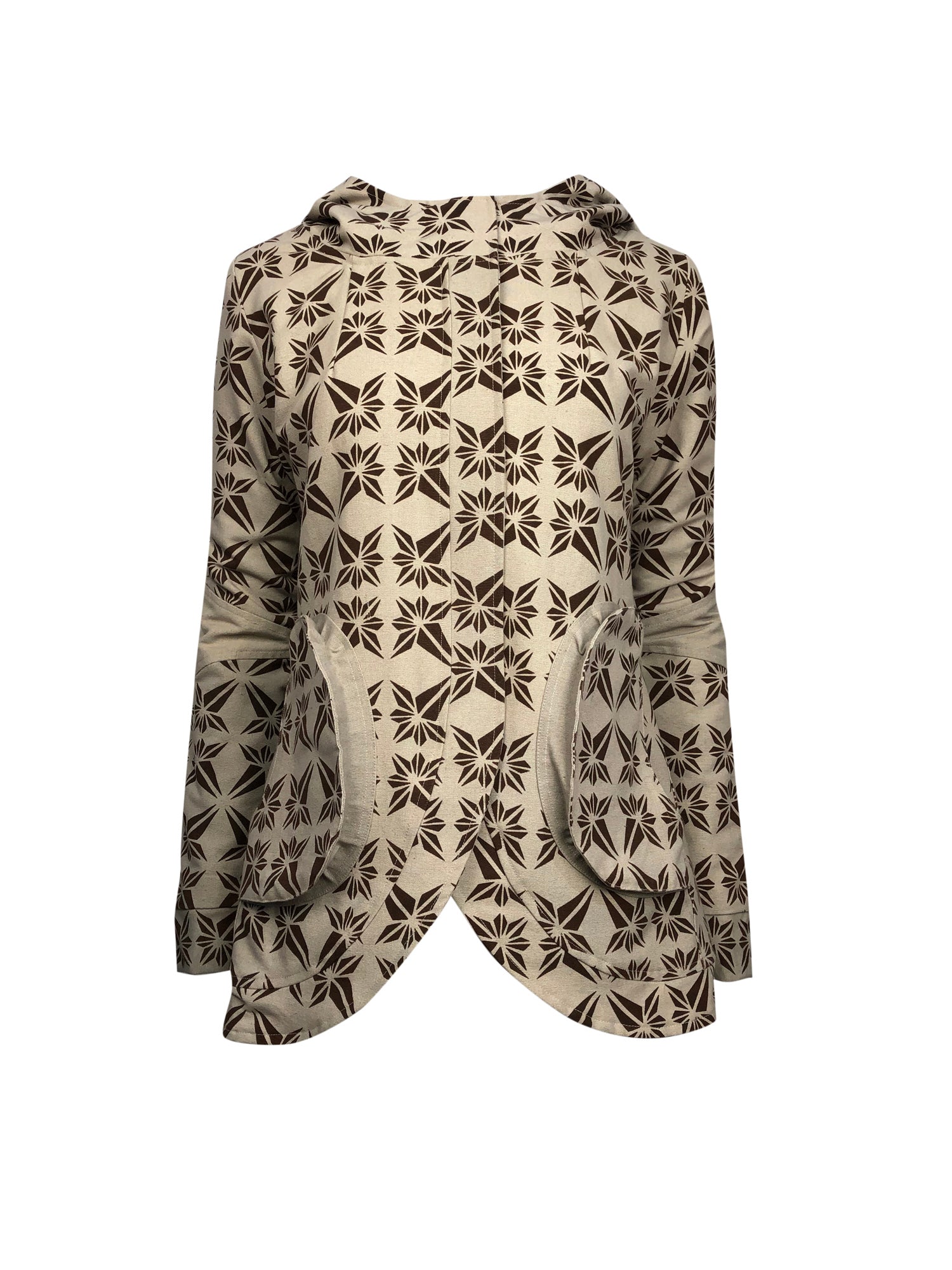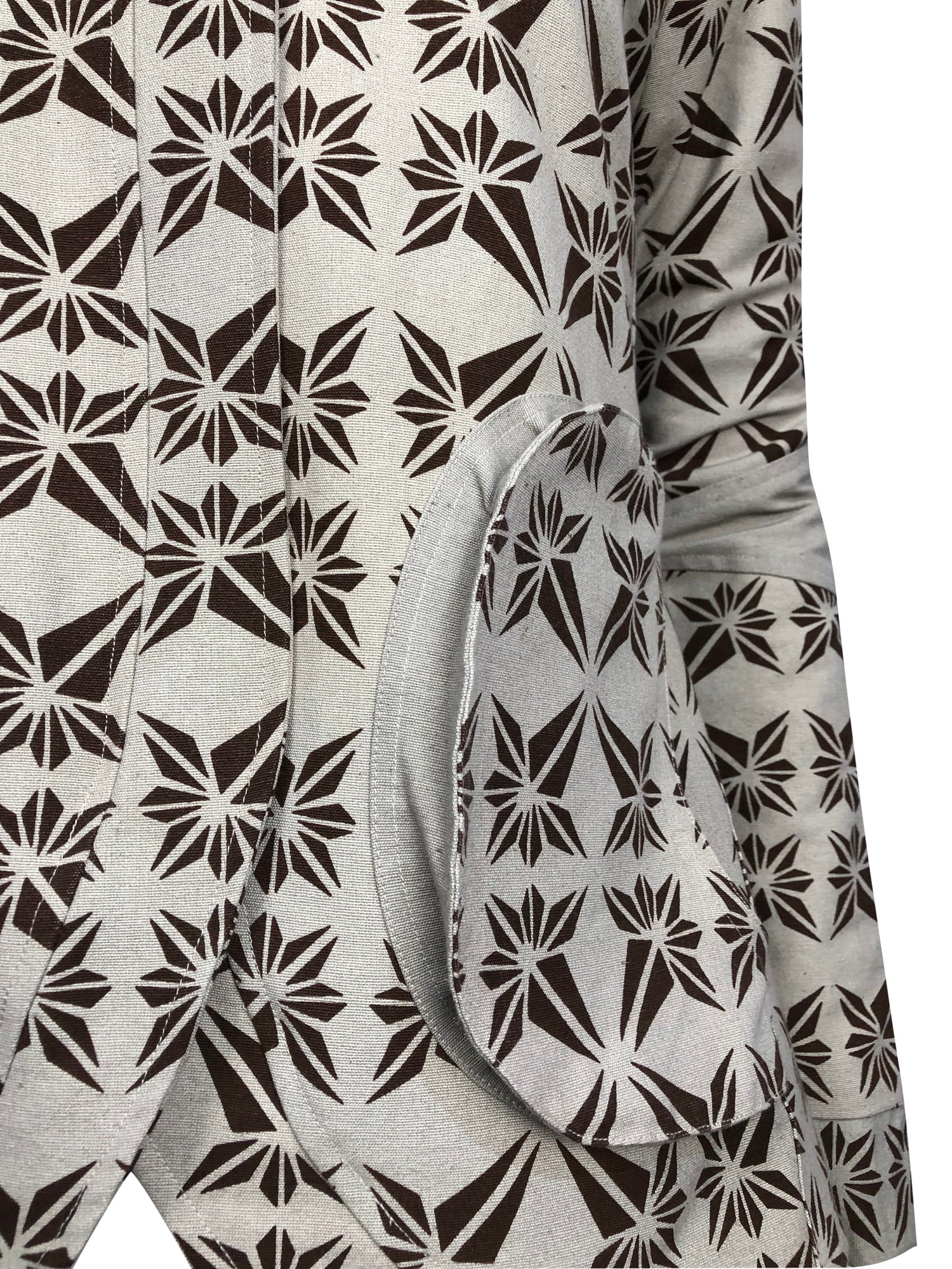 When it's time to transition from hot to cold weather this jacket with fit, flair and the coziest cotton fleece lining is the perfect choice! The cotton canvas has a beautiful Dhaka design silk screen with contrast inserts of solid colour on the shoulder, pockets and sleeves. The hidden zipper and velcro closures give the shape and style prominence, and the pockets with their expansion panels hide another little secret – extra pockets deep inside for keys, cards or phones!