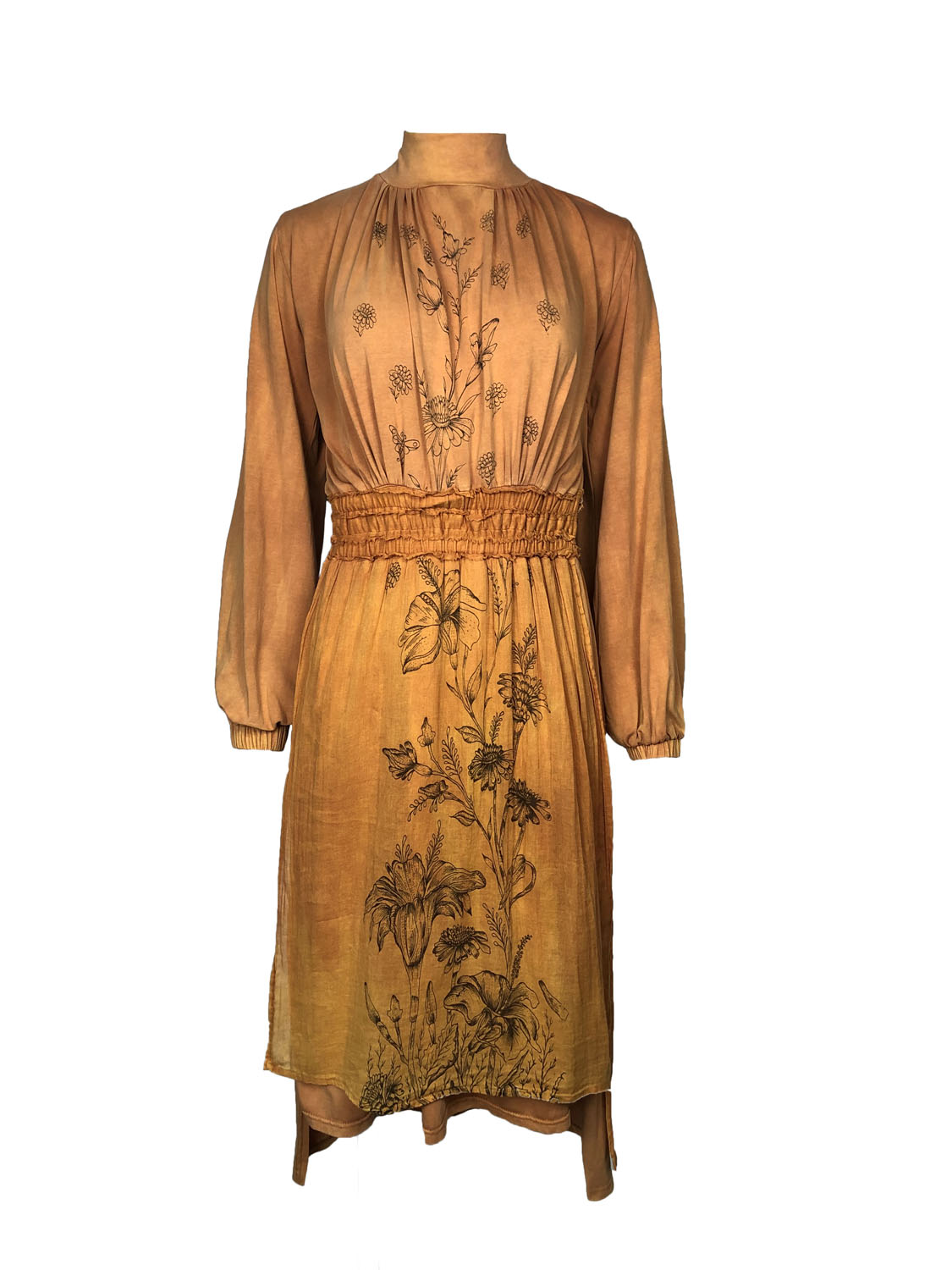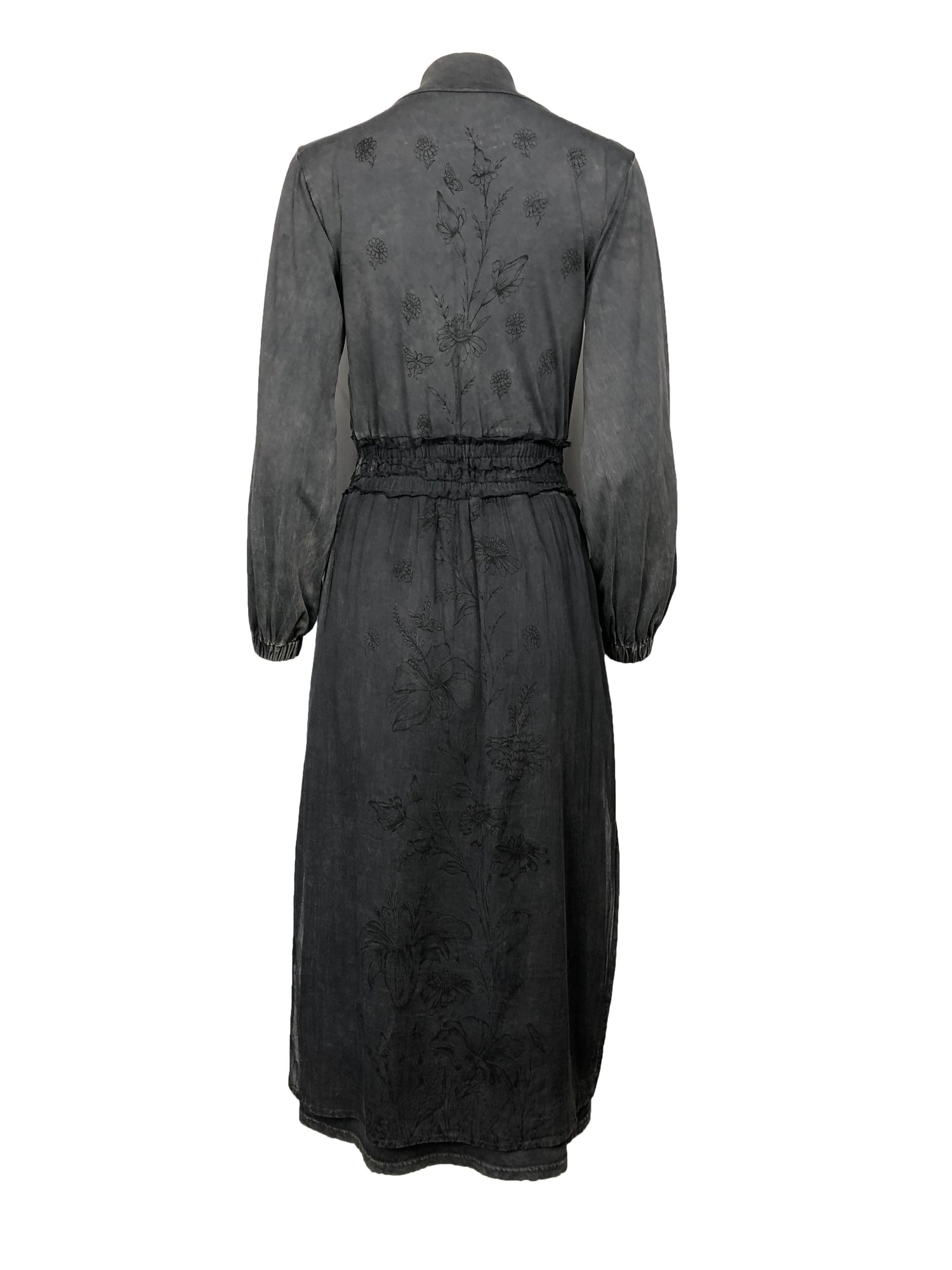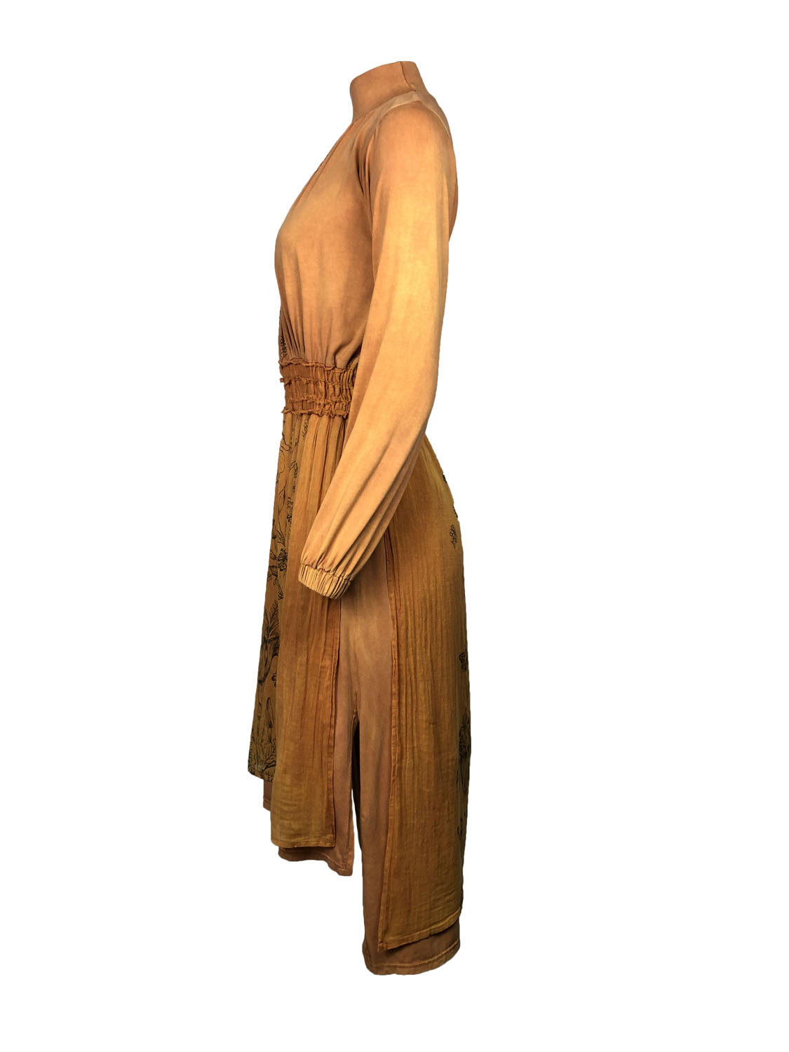 This dress is defined not just by its practicality but also by its attractive and serene sensibility. From the mock turtleneck collar down to the hem it is a column of elegant proportions and small luxuries. The high low hem ends at approximately mid-calf in the front and above the heel in the back. With a skirt designed for ease of movement this is a lovely walking dress. Made of soft stone washed cotton jersey it slips easily over the head and has soft elasticized gathers at the wrists and waist. It is however not all about comfort and utility: this dress has front and back panels of a lightweight semi-sheer cotton voile. The panels are silk screened by hand with a beautiful design of trailing vines and flowers. This dress will make you feel both ethereal and down-to-earth. It is a dress of quiet contemplation and visions of possibility.