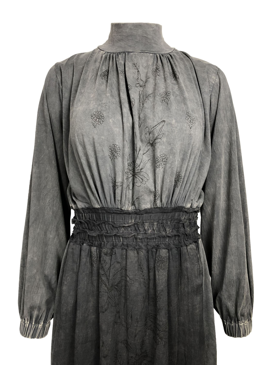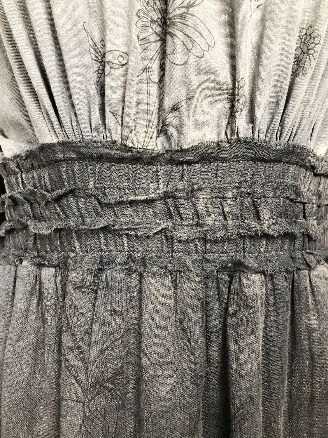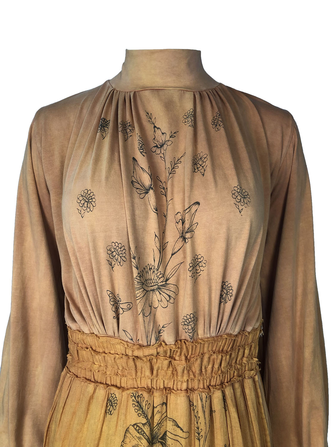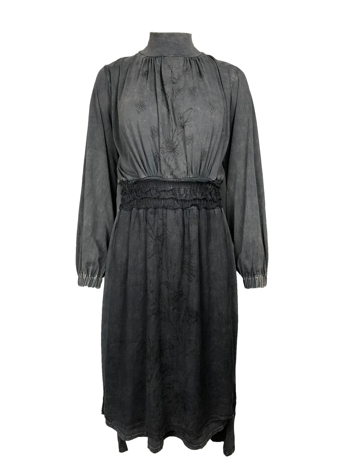 This dress is defined not just by its practicality but also by its attractive and serene sensibility. From the mock turtleneck collar down to the hem it is a column of elegant proportions and small luxuries. The high low hem ends at approximately mid-calf in the front and above the heel in the back. With a skirt designed for ease of movement this is a lovely walking dress. Made of soft stone washed cotton jersey it slips easily over the head and has soft elasticized gathers at the wrists and waist. It is however not all about comfort and utility: this dress has front and back panels of a lightweight semi-sheer cotton voile. The panels are silk screened by hand with a beautiful design of trailing vines and flowers. This dress will make you feel both ethereal and down-to-earth. It is a dress of quiet contemplation and visions of possibility.