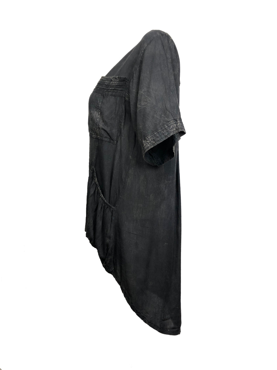Soft and yet structured, this top is flattering on everyone. A fairly straight cut body is given shape and structure with the top stitched V-neck and set in sleeves, which end above the elbows. The hemline scoops up slightly at the front where it is gathered ever go gently. The two higher pockets echo the two lower pockets which end at the hemline and make everyone so very happy!