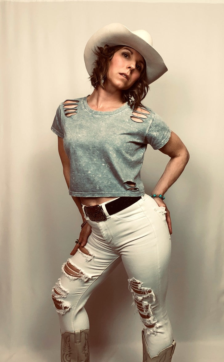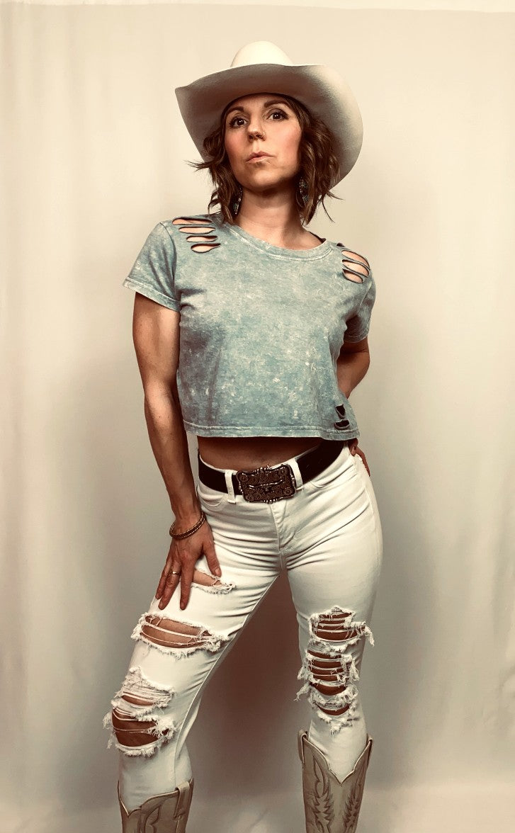 This classic cropped t shirt is a summer favorite! It is made out of quality 100% cotton and hand dyed with razor cuts in the fabric for an authentic look. The neckline is conservative and the shape a boxy modern style. Great for tucking in an overnight bag to travel easy!
