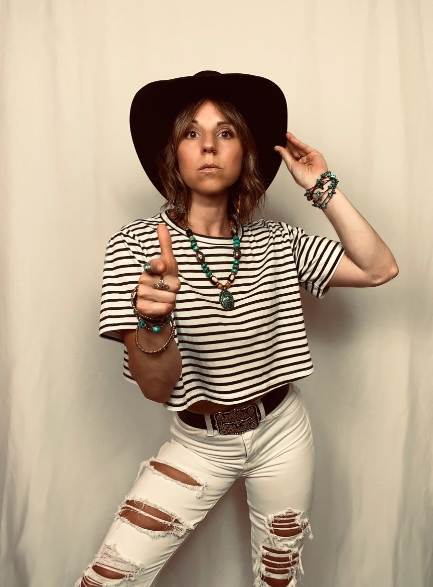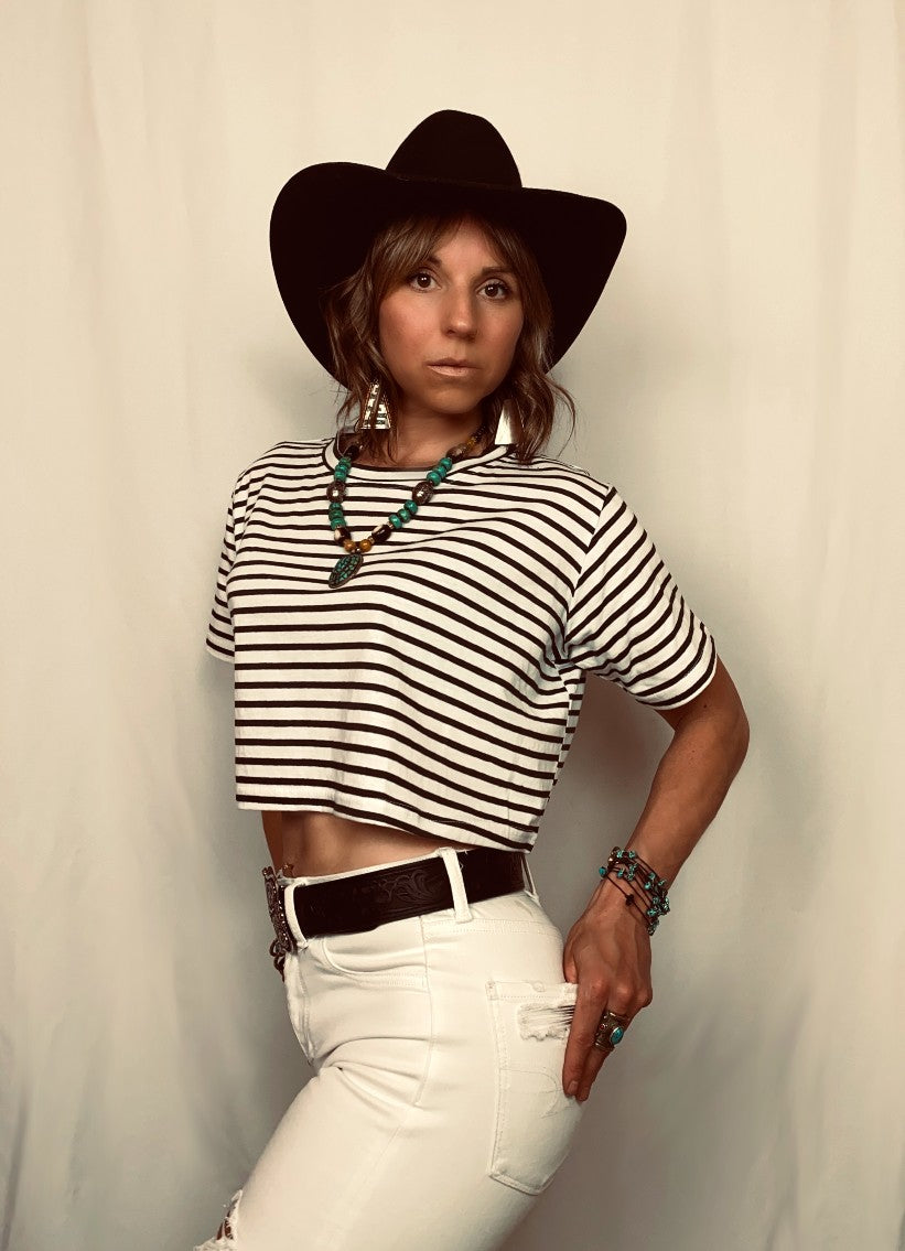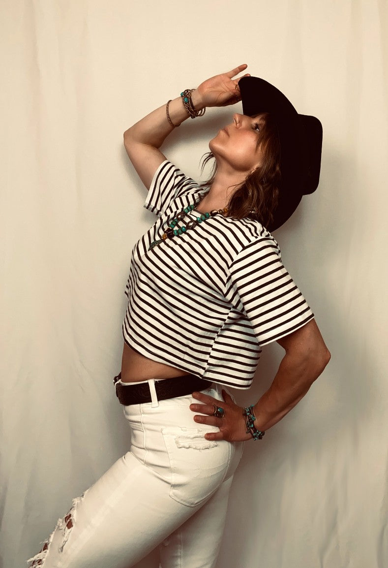 This classic cropped t shirt is a summer favorite! It is made out of quality 100% cotton and hand printed with eye catching stripes. The neckline is conservative and the shape a boxy modern style. Great for tucking in an overnight bag to travel easy!