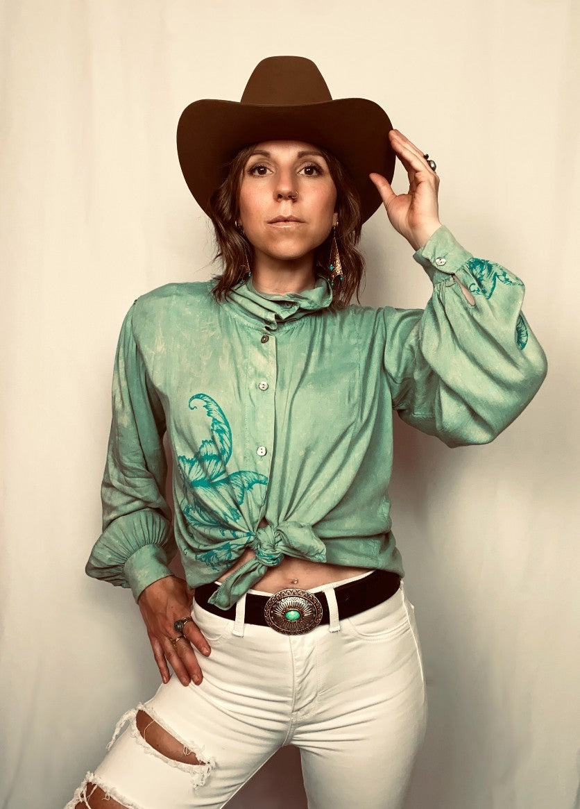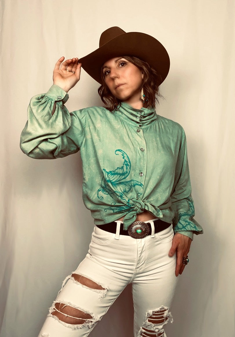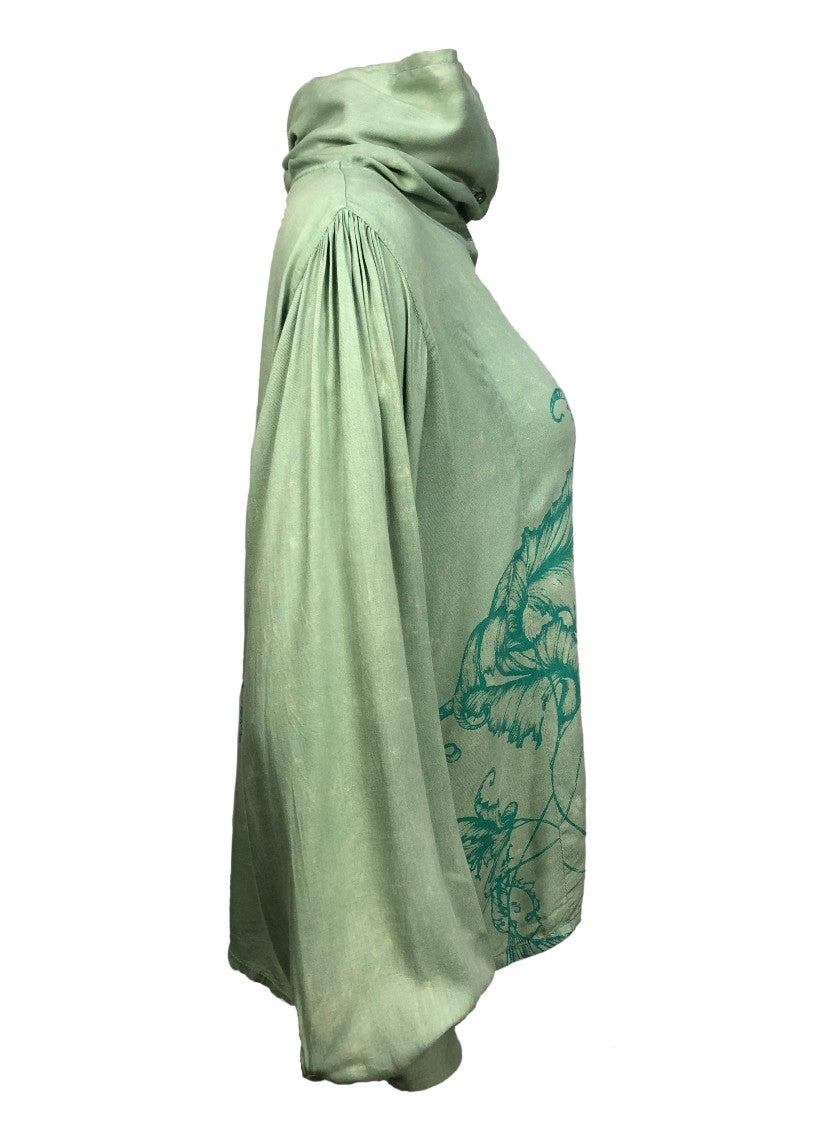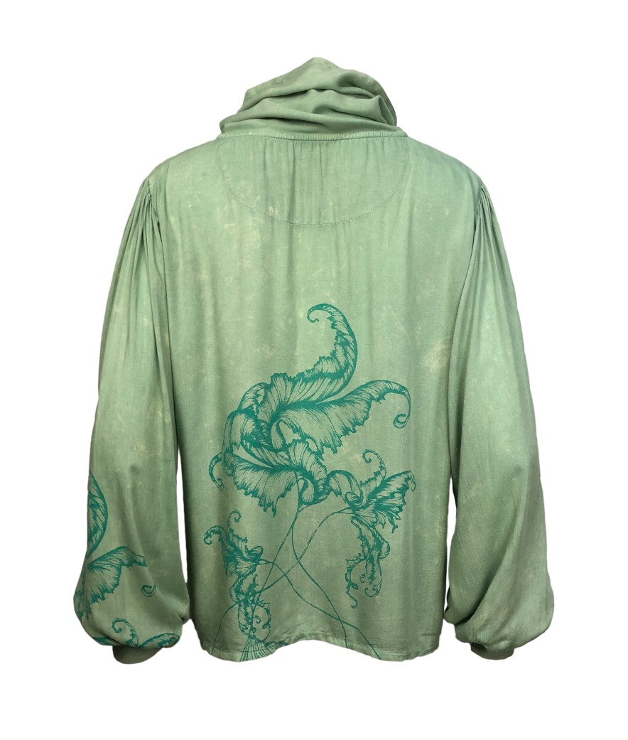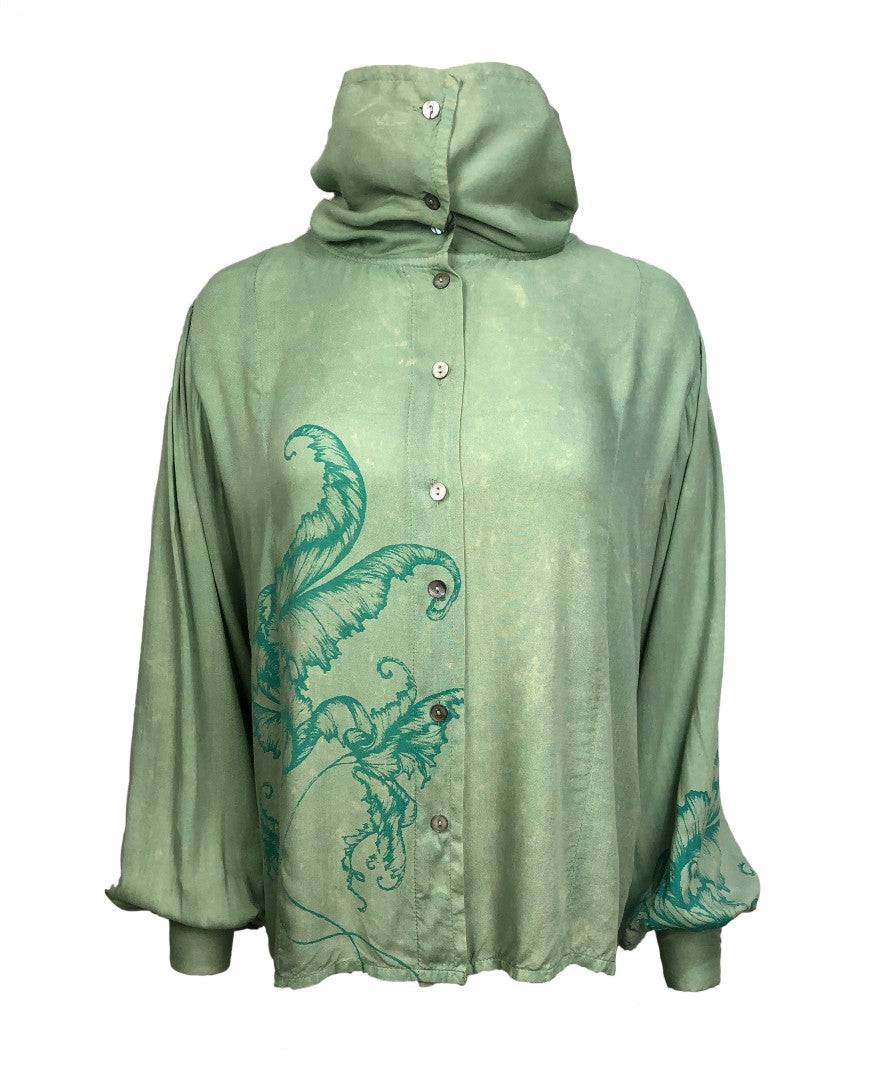 This is a sweet little blouse ,with a slightly boxy shape, full sleeves and longer collar, which can be left open or buttoned all the way up for a soft, slouchy look. The same mother-of-pearl buttons adorn the body and cuffs of this top and shimmer as you move. The soft look and feeling is further accentuated by the beautiful scrolling and swirling leaves and tendrils silk screened on both the front and back. So decidedly feminine and demure, you can wear it anywhere!