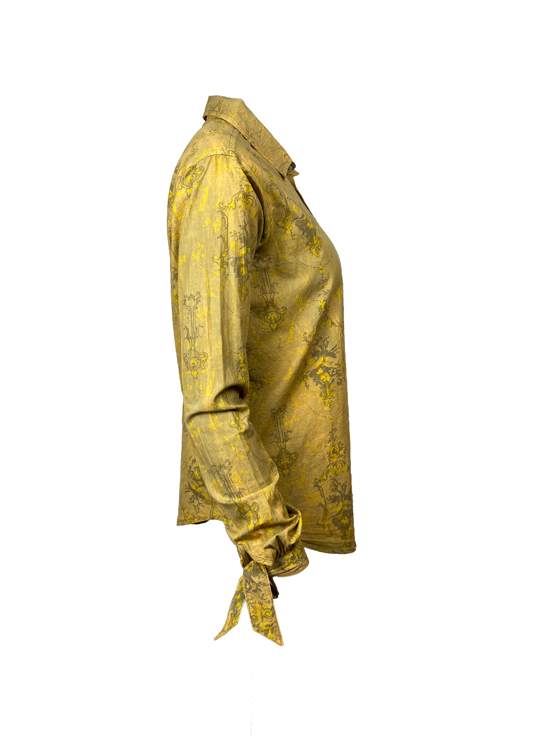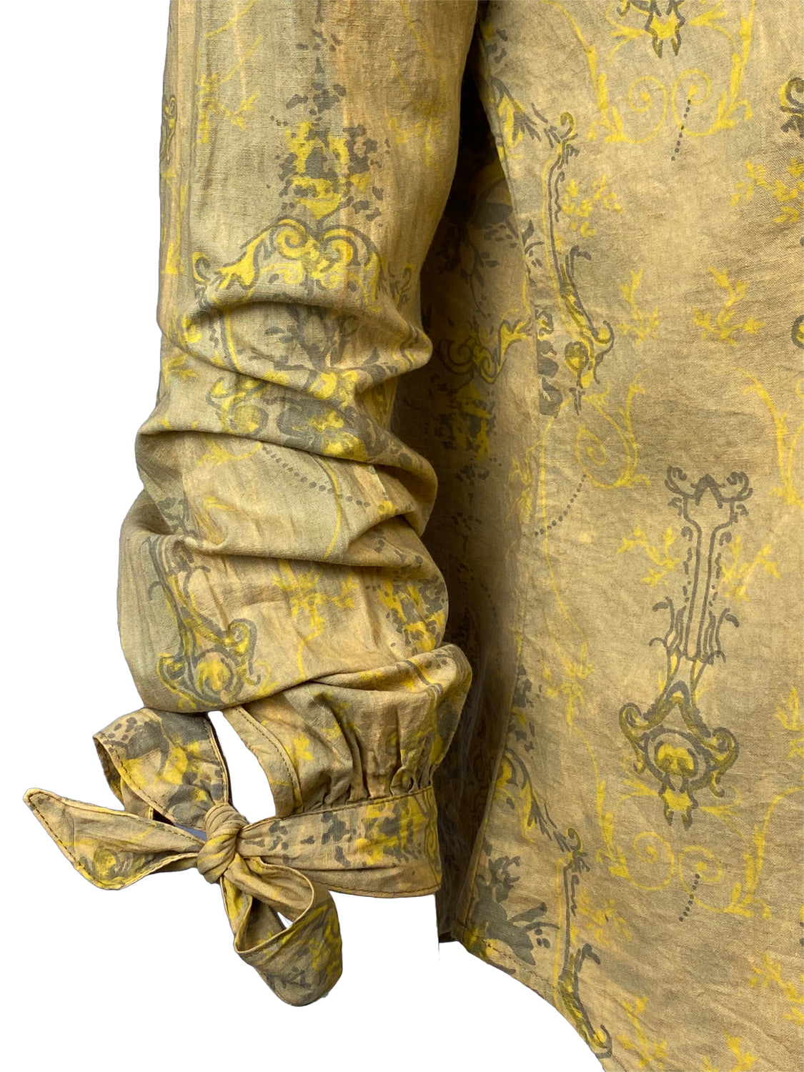 Living a city life with your heart in the country or a country life with your heart in the city? Whether your day consists of homesteading or urban living we have a shirt in our collection which will traverse this divide with individuality and charm. Made of cambric cotton, which is a very fine cotton without any weaving faults, the fabric is then silk screened by hand and stone washed. The result is a buttery soft garment with a fine crinkle effect which mimics a soft leather. This is a classic one pocket shirt with a structured collar, back yoke, loose fit and shirt tail hem. Besides the lovely fabric we have added a few flourishes like shell buttons for a touch of shimmer and bow tie cuffs because they are so pretty! No matter where life takes you, the chance to enjoy the gurgle of a stream or the crackle of a campfire under starry skies is always a gift to be enjoyed!
