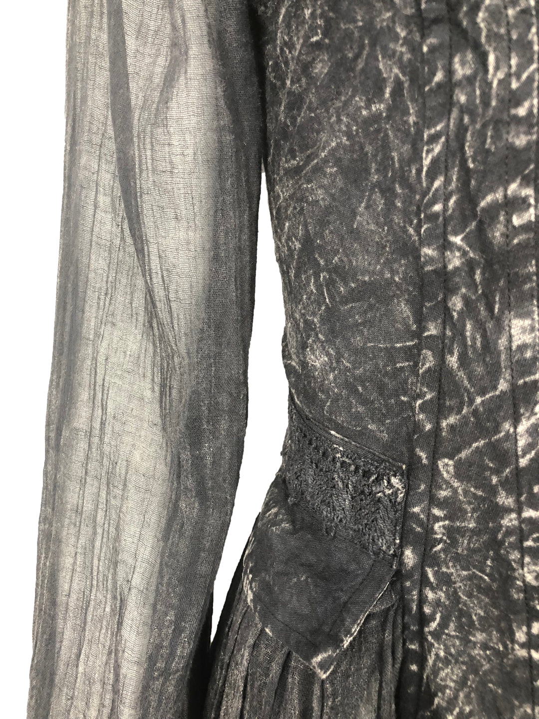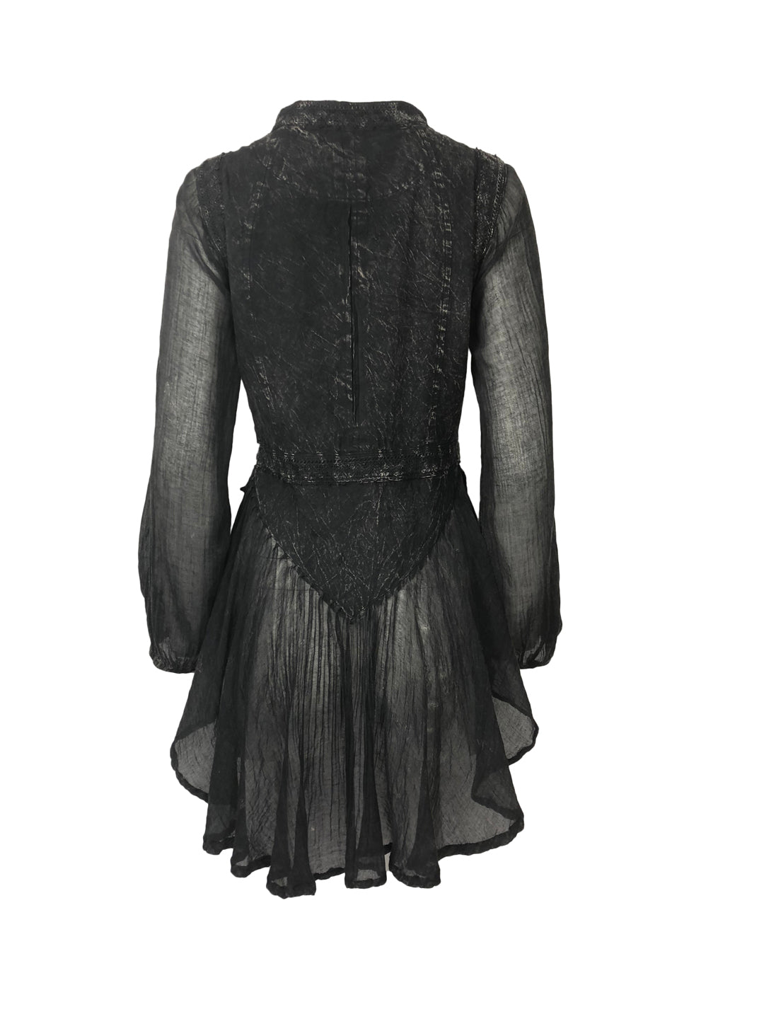This multi purpose top is a study in contradictory features: the body is constructed of tailored panels with an offset zipper, the sheer sleeves and peplum are made of a lighter weight cotton lawn fabric - then the garment is stone washed for an ethereal finish. It can be worn as a top or jacket and has the added convenience of pockets. Oh so slightly rugged and not so slightly feminine.